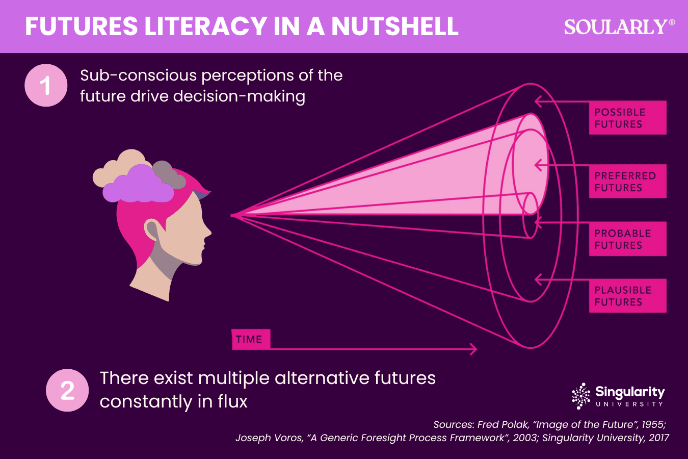 Humans’ creative capacity for the future, and the multitude of futures that lie ahead, together are futures thinking principles 101. Education around these concepts is known as futures literacy. I’m writing this in hopes that futures literacy becomes the driving force of our generation.